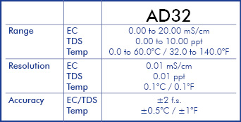 - Thang đo độ dẫn: 0.00-20.00µS/cm, độ phân giải: 0.01µS/cm, 0.01/0.1mS/cm, độ chính xác: +/- 2 trên thang đo.